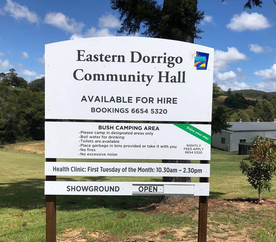 Eastern Dorrigo Community Hall and Showground provides hall and showground facilities to locals and visitors. The hall is available to hire for community groups, functions, overnight stays etc, and has an attached kitchen, BBQ facilities, toilets and showers.