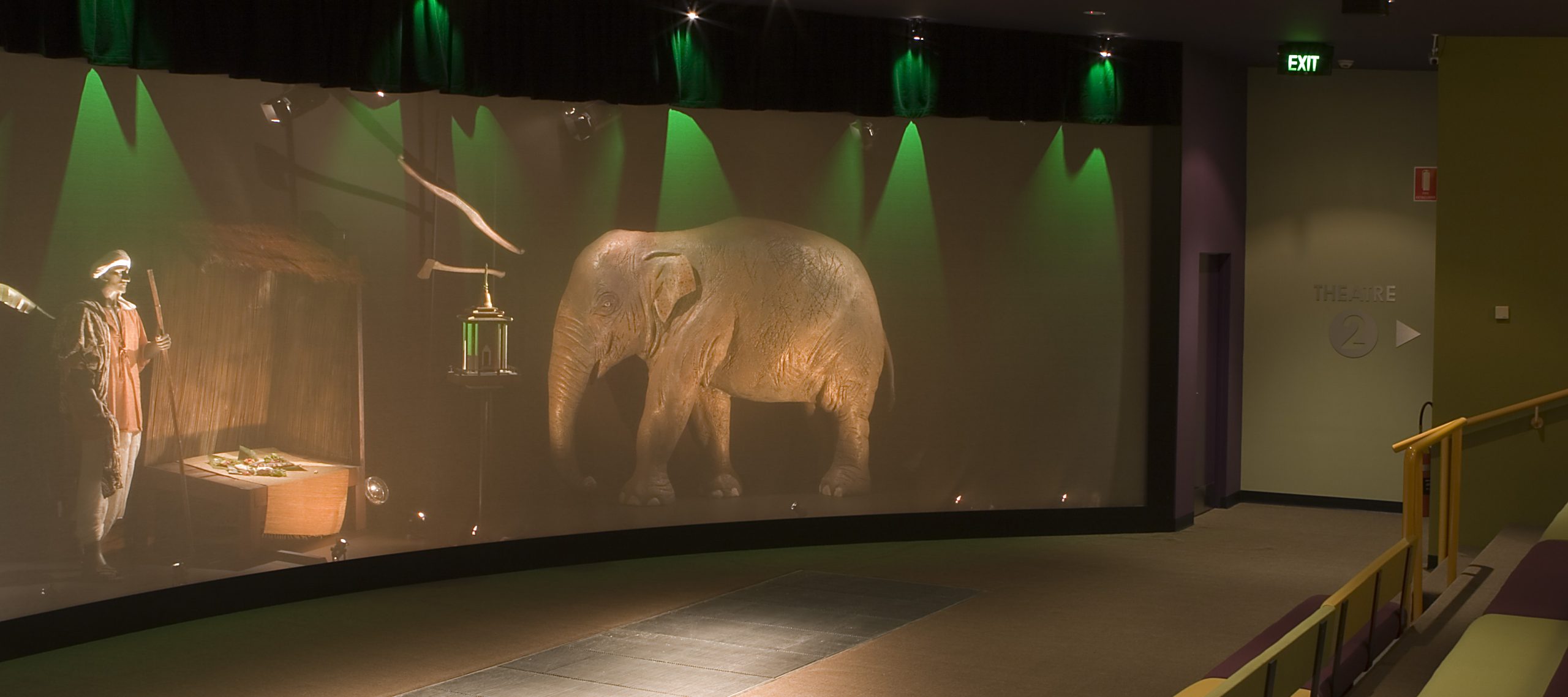The state-of-the-art system projects images and film onto a scrim screen with an object stage background. The presentation details the discovery of bananas and their advance through history to the present day.