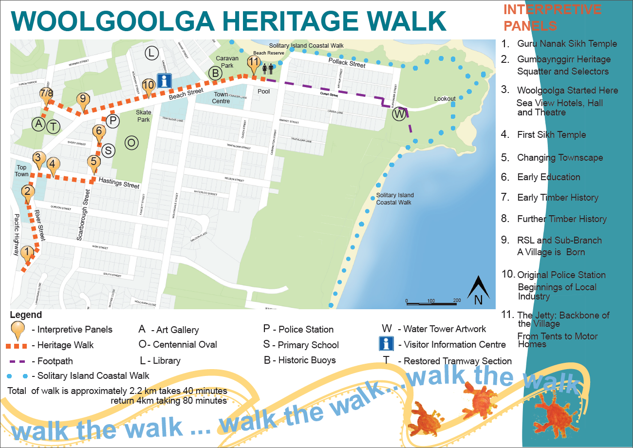 The trail includes 16 stations along a 2.2 km walk with historically themed panels along a route between ‘Top Town’ on River Street and the Woolgoolga Beach Reserve. It takes around 40 minutes to walk (one way).