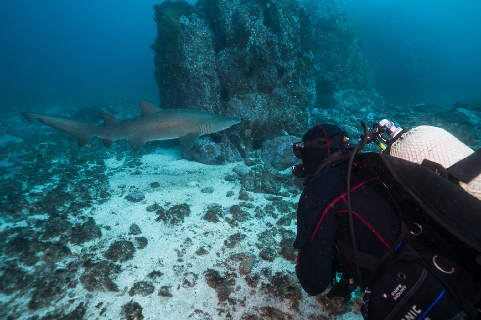 Roll in and get your adrenalin pumping with Solitary Island’s Shark Dive! Immerse yourself within an excess of 30+ Grey Nurse Sharks while drifting through an underwater arch. Swim along the gutters surrounded by boulders and ridges at a depth of 30 metres. Large anemones adorn the landscape and host large varieties of clownfish. A pile of boulders rise up from the depths offering a perfect place to watch schooling pelagic fish.